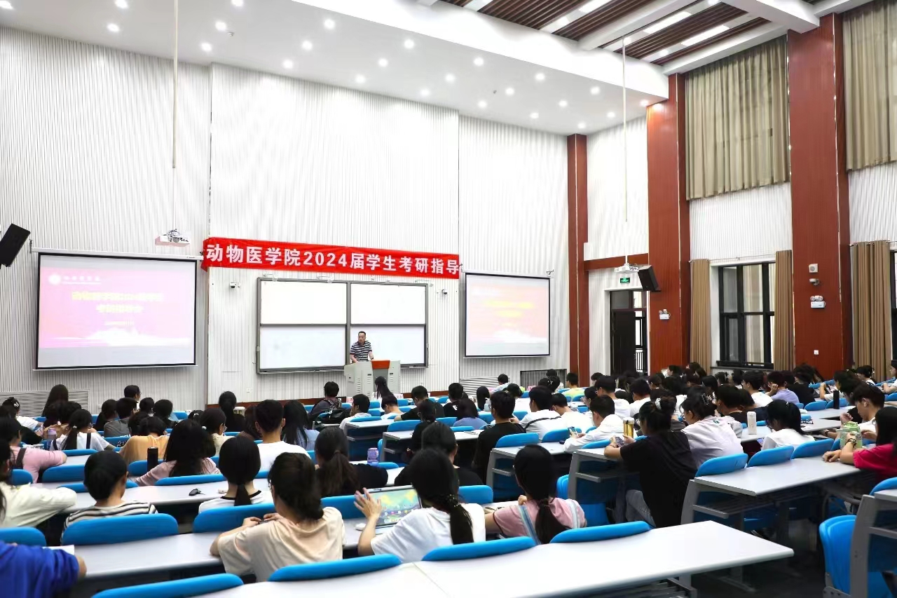 在龙子湖校区繁塔楼C区大教室四召开2024届毕业生考研指导会。院党委副书记杜家方、预防兽医系党支部书记、系主任李永涛、院团委书记张心晨、院团委副书记冯佟出席会议,全体2024届学生参加会议。