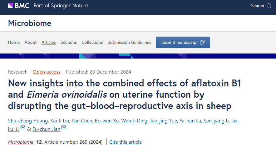 菅复春教授团队在微生物学权威期刊《微生物组(Microbiome)》在线发表了题为《通过扰乱肠-血液-生殖轴黄曲霉毒素B1和绵羊艾美球虫联合影响绵羊子宫功能的新见解》(New insights into the combined effects of Aflatoxin B1 and Eimeria ovinoidalis on uterine function by disrupting the gut-blood-reproductive axis in sheep)的研究性论文。该研究以绵羊为模型,系统揭示了球虫在霉菌毒素存在下联合对绵羊生殖系统的毒性损伤机制。