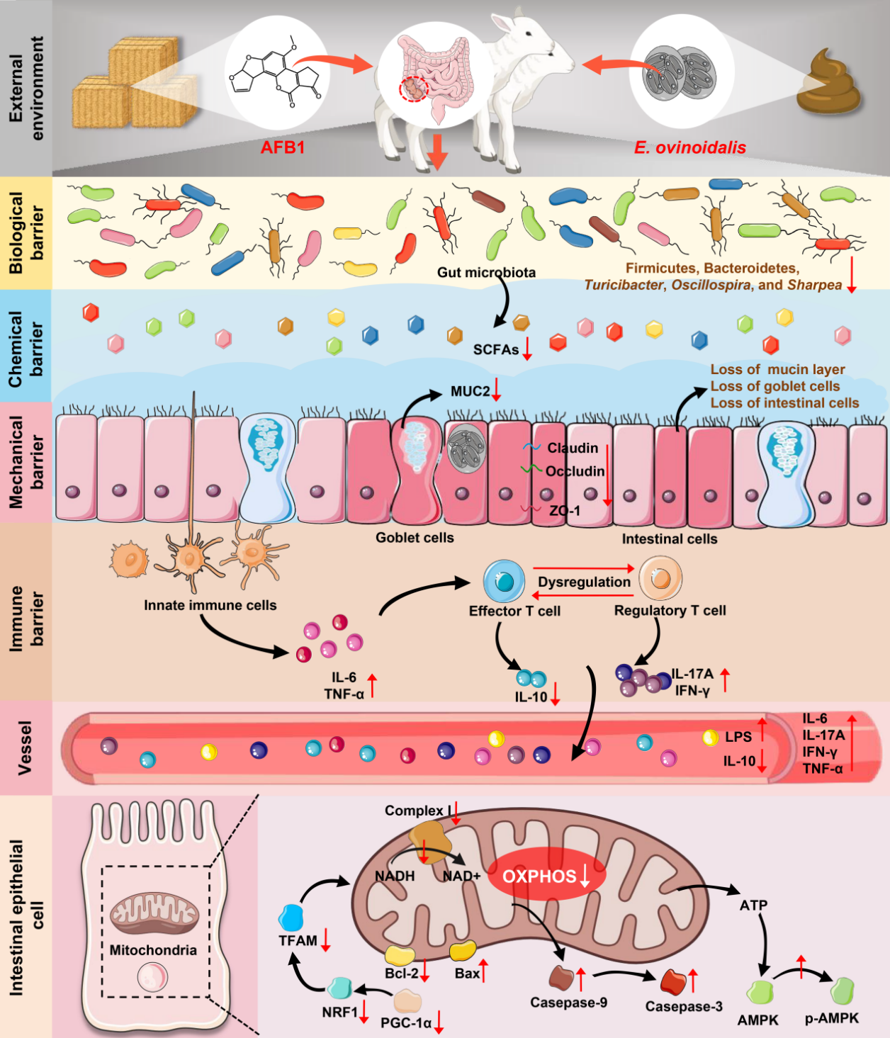 图1:AFB1和球虫联合致绵羊盲肠损伤机制