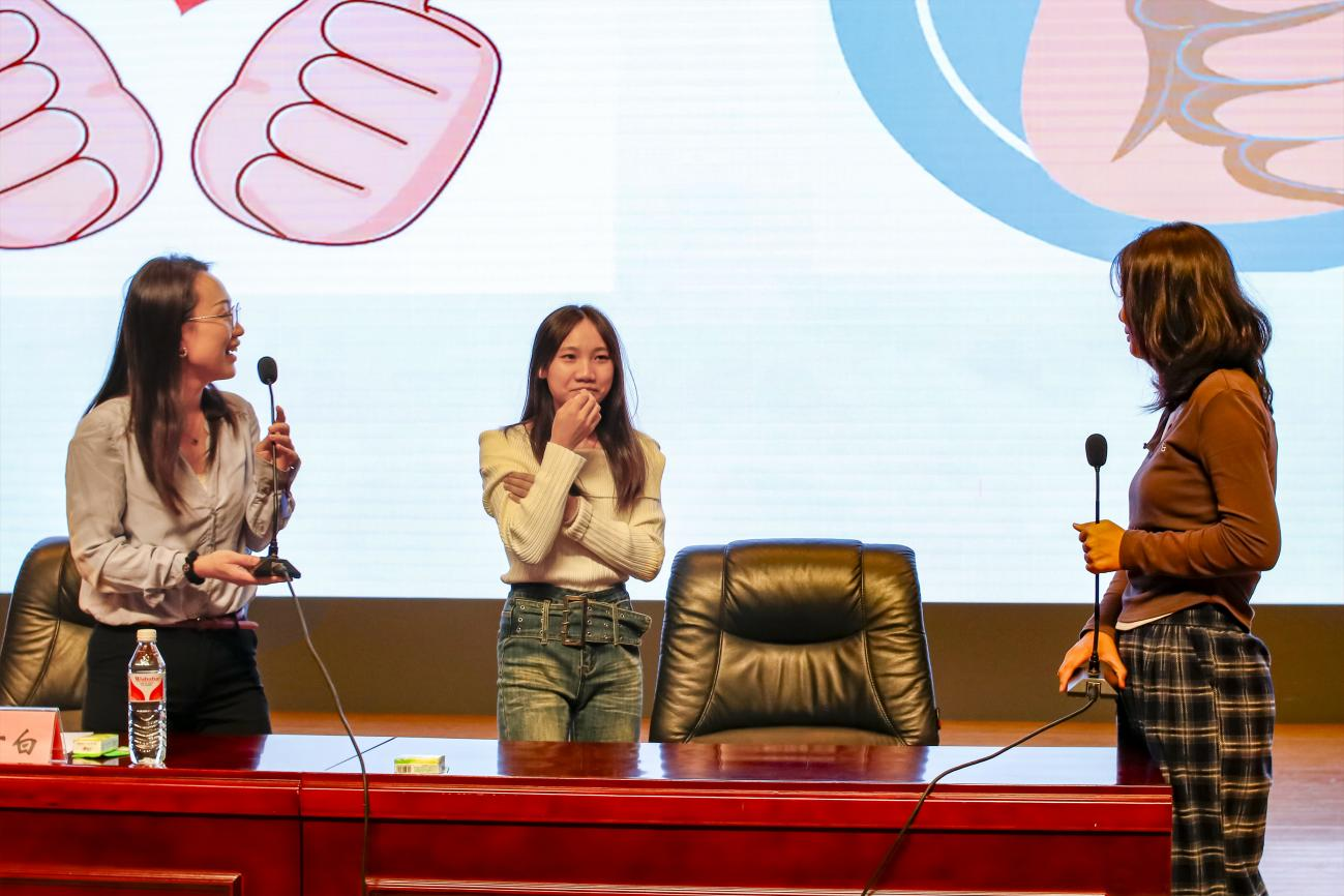 讲座前,董方白以一个热身小游戏开场,带动了全场气氛。随后以ppt 演示的形式开始讲座,董方白主要从两大方面为在场学生讲解心理疏导相关知识。一是提出日常生活中大家要修身养性、自我关怀,积极展望未来等;二是聚焦新生,以大学生常见的心理问题为切入点,为大家答疑解惑并介绍了许多小技巧和方法。讲座期间,董方白与台下学生积极交流互动,现场气氛轻松活跃。最后,她深切表达了对新生们的希冀,本次心理健康讲座圆满结束。