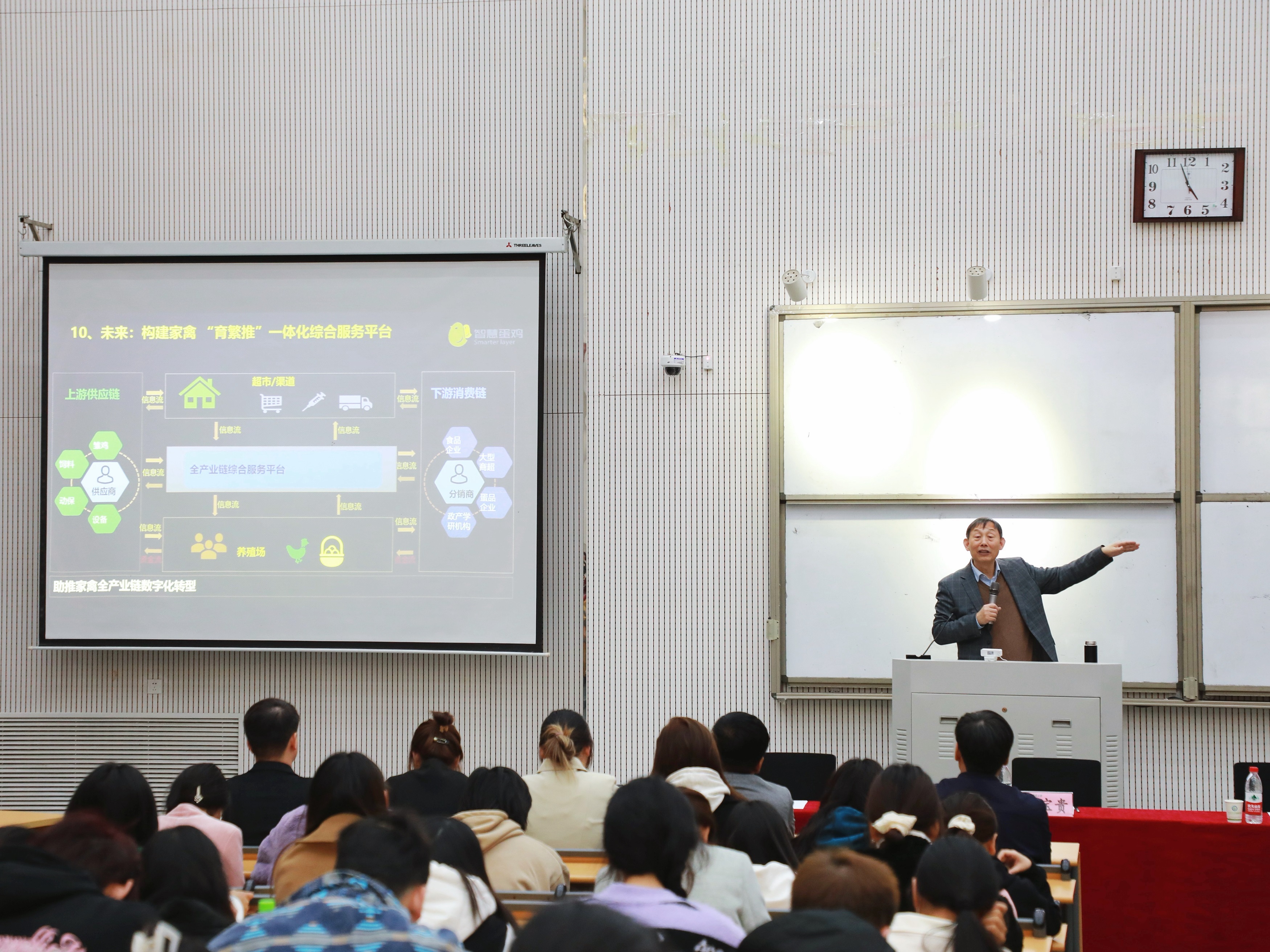 周宝贵以中国家禽行业发展现状及未来为切入点,分析目前行业存在的现状与分析,层层递进、深入讲解。通过对沃德家禽行业发展之路、数字化的推动发展,剖析现代企业对于人才的需求,分享行业未来发展趋势。结合“互联网+”大趋势,强调创新性转化、创新性发展的重要性,要与时俱进、抓住机遇、发展机遇。详细介绍了沃德股份是如何坚守40年,解决老百姓吃蛋难的问题,实现中国蛋鸡高质量发展,并以此激励同学们坚持初心,发现自身优势,学好专业知识,坚定专业自信。