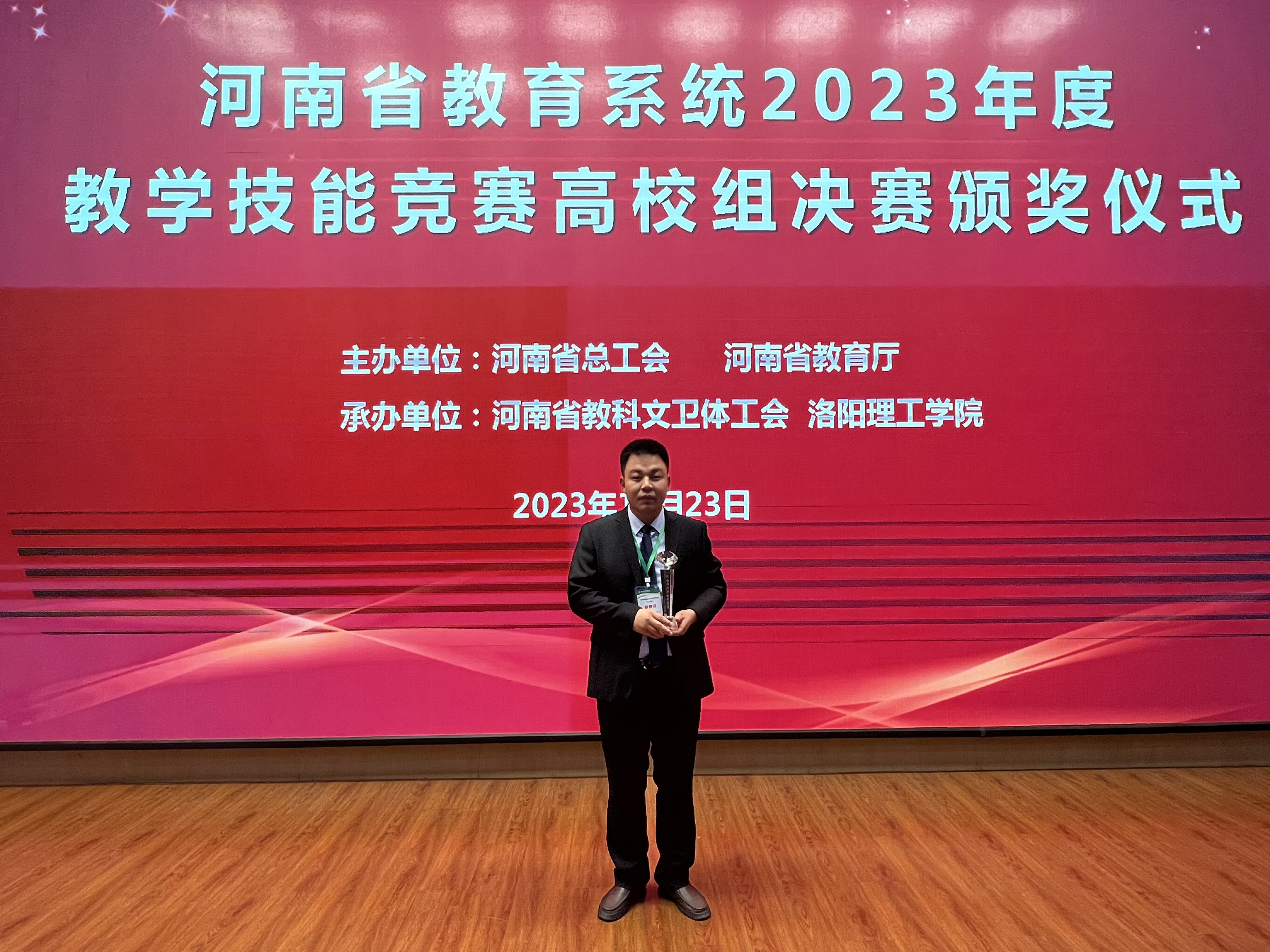 10月22日至23日,由河南省总工会、河南省教育厅主办的河南省教育系统2023年教学技能竞赛决赛在洛阳举行。经过激烈角逐,丝袜av 金鑫老师位列医科组第三名,荣获一等奖的好成绩,并被河南省总工会、河南省教育厅授予“河南省优秀教学标兵”荣誉称号。