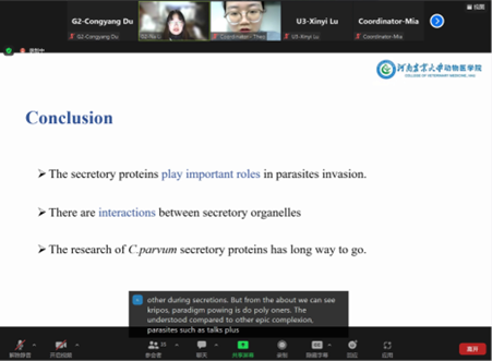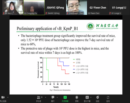 Cryptosporidium parvum》为主题,汇报了微小隐孢子虫分泌细胞器:微线体、棒状体、致密颗粒及其所分泌的功能蛋白的最新研究进展。杜聪阳以《Isolation, Identification and preliminary Application of Phage vB_KpnP_B1 of