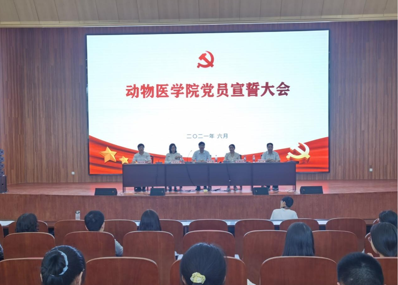 于龙子湖校区图书馆报告厅举办党员宣誓大会,院党委书记廖仲磊、院长张龙现、院党委副书记王照兰、副院长杨百丽、李奎、魏战勇出席大会,大会由王照兰主持,学院全体师生党员参加会议。大会在国歌声中拉开帷幕。