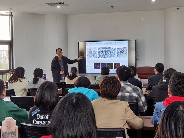 报告会上,龙少军教授对其团队在弓形虫微孔蛋白和顶复体蛋白的筛选分析和生物学功能鉴定的研究作了详细的讲解,会议上,龙少军教授以弓形虫微观形态下的微孔为切入点,结合蛋白质组学和转录组学数据,筛选出新的可能在微孔内表达的蛋白,应用CRISPR和生物素临近标记技术对新鉴定的蛋白进行标记定位和互作网络分析,证明弓形虫可能是通过微孔摄取宿主细胞细胞质物质,维持生长发育,为顶复门原虫的微孔和顶复体研究提供了新的思路和方法依据。