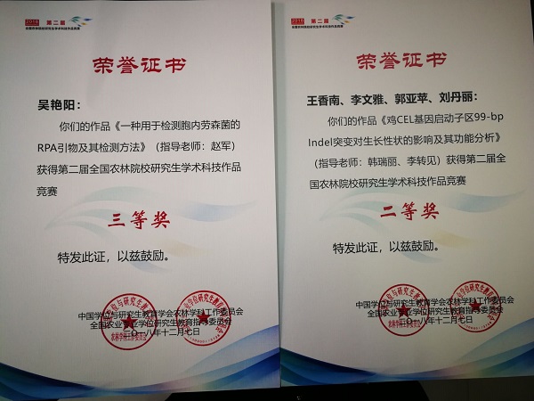 在近期闭幕的第二届全国农林院校研究生学术科技作品竞赛中,丝袜av 研究生王香南、李文雅、郭亚苹、刘丹丽团队的作品《鸡CEL基因启动子区99-bp Indel突变对生长性状的影响及其功能分析》(指导教师:韩瑞丽、李转见)荣获二等奖;吴艳阳的作品《一种用于检测胞内劳森菌的RPA引物及其检测方法》(指导教师:赵军)荣获三等奖。