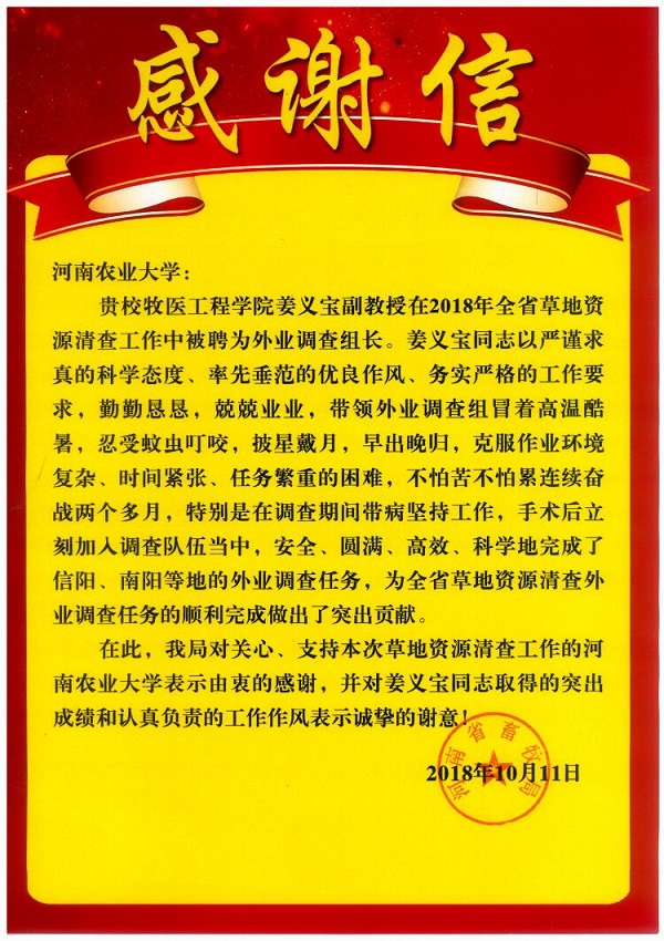 日前,丝袜av 收到来自河南省畜牧局的感谢信,对丝袜av 教师王成章、姜义宝在2018年全省草地资源清查工作中所做的出的贡献表示感谢,对他们严谨求真的科学态度、率先垂范的优良作风、务实严格的工作要求、吃苦耐劳的工作精神给予高度评价。他们的表现也展示了我们牧医人的风采。(文/韩笑)