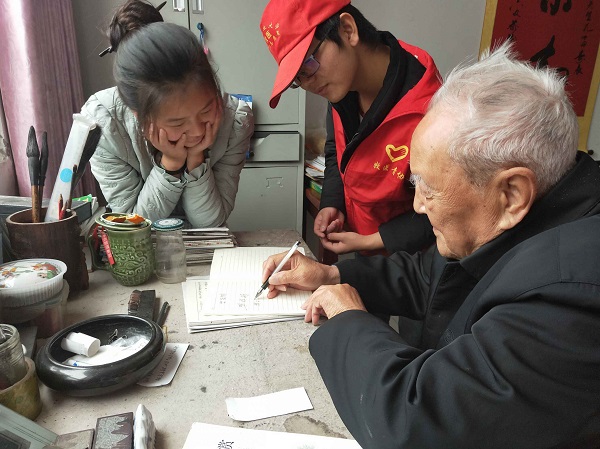 志愿者们和老人交流诗词