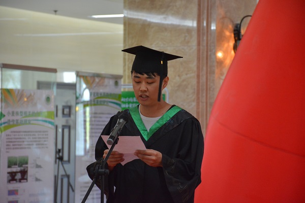 2018届动物检疫1班学生樊杰作为毕业生代表上台发言。他带领全体毕业生高呼三遍牧医精神,重温牧医精神带来的感动与激励,并回顾了大学四年学习、工作感受,感慨时光飞逝,依依惜别,祝福母校越来越好。